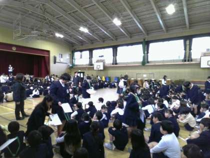 今月に行われる桑津っ子フェスティバルに向けて、全体でたてわり集会を行いました。