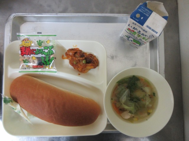 じゃがいものミートグラタン、レタスのスープ、豆こんぶ、マーガリンです。