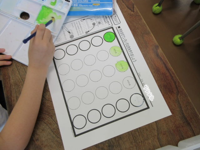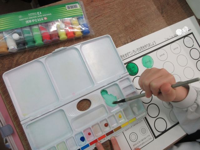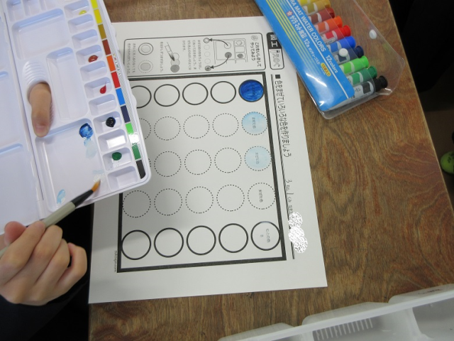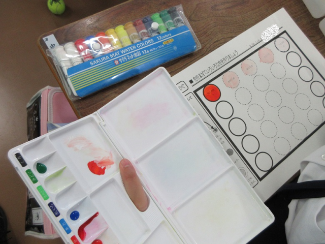 5色の絵の具と白色を混ぜて、水加減を調節して色を塗っていきました。