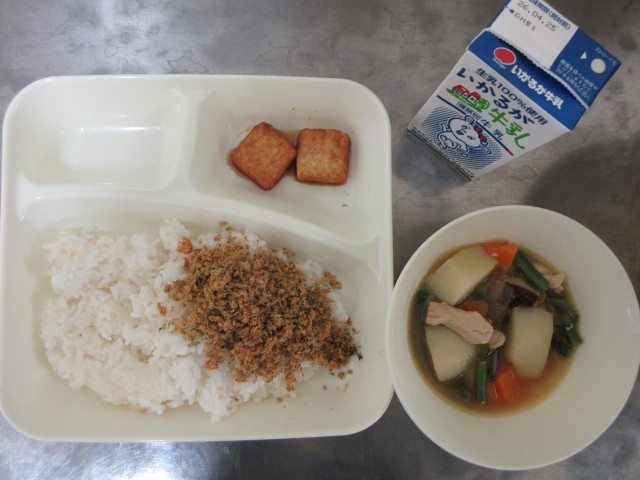 鶏肉とじゃがいもの煮もの、あつあげのしょうゆだれかけ、紅ざけそぼろです。