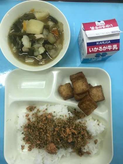 鶏肉とジャガイモの煮物、厚揚げの醤油だれかけ、紅さけそぼろ、ご飯、牛乳