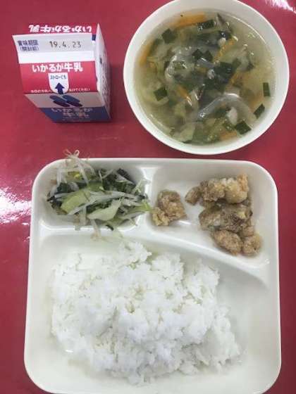 鶏肉の唐揚げ、中華スープ、チンゲンサイとモヤシの甘酢あえ、ご飯、牛乳