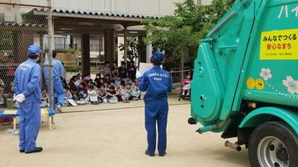 まず、パッカー車の種類やオルゴール音について知りました。 次に、作業着体験やごみをパッカー車に入れて圧縮させる体験をしました。ごみの分別の仕方も学習しました。
