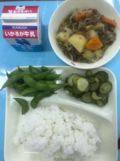 肉じゃが、きゅうりのカツオ梅風味、枝豆、ご飯、牛乳