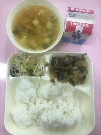 プルコギ、豆腐スープ、青梗菜とモヤシの柚子の香和え、ご飯、牛乳