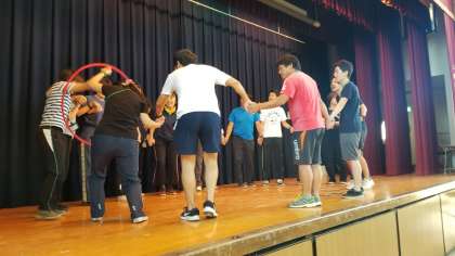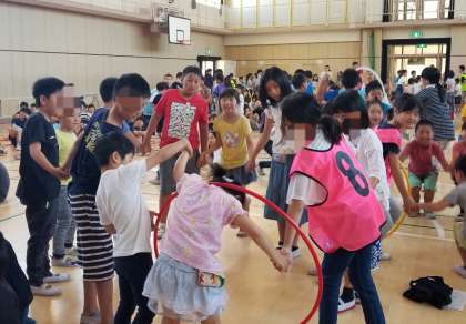班で円になって手をつないで、フラフープをまたいだりくぐったりして送っていきます。