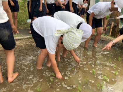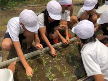 JA大阪の方に苗の持ち方などを教えていただきながら、ビオトープの田んぼで田植えをしました。秋の稲刈りまで観察を続けていきます。おいしいお米が実りますように!