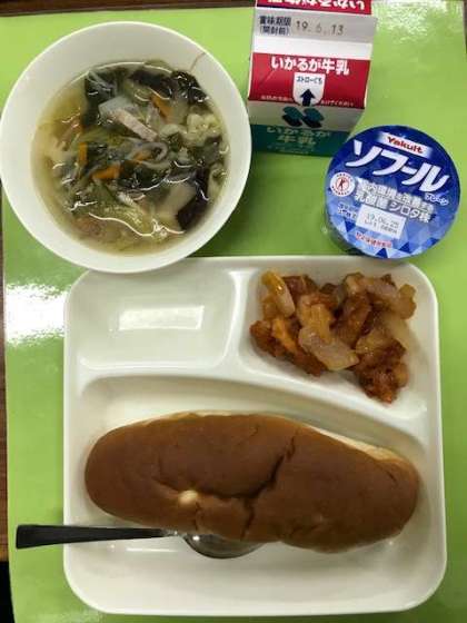 えびのチリソース、中華スープ、ヨーグルト、おさつパン、牛乳
