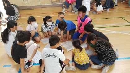 6日の児童集会では、各ファミリー班でお店の回りかたを決めました。