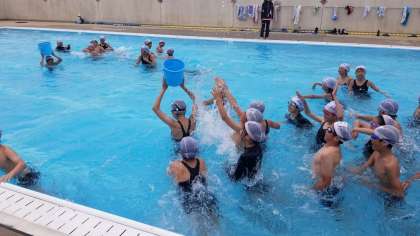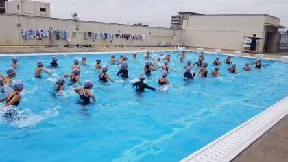 まずは、ポニョの音楽に合わせての水慣れです。見学の子どもたちもノリノリで一緒に踊ります。