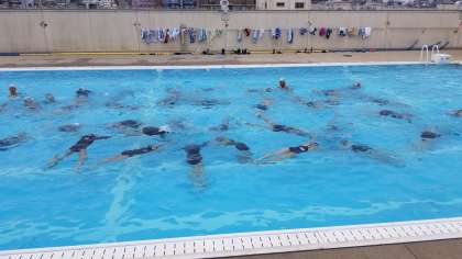 水慣れの最後は、2人、4人、8人…、と手をつないで浮き、美しい輪ができました。
