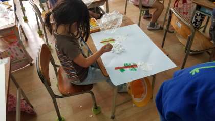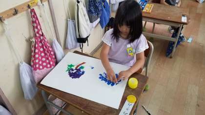 図工の時間には、はり絵とクレヨンで紫陽花を制作しています。