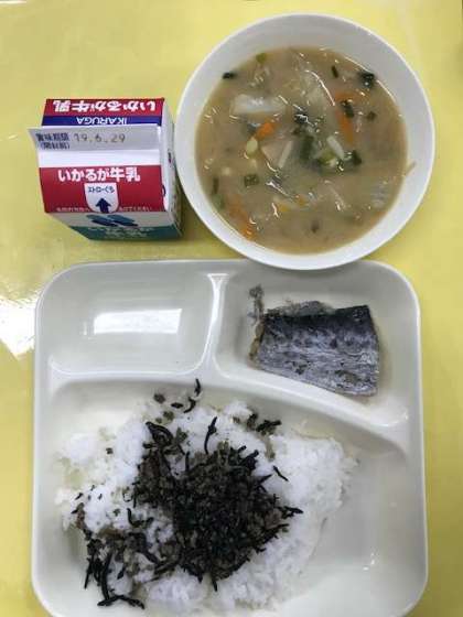 さごしの塩焼き、味噌汁、牛ひじきそぼろ、ご飯、牛乳