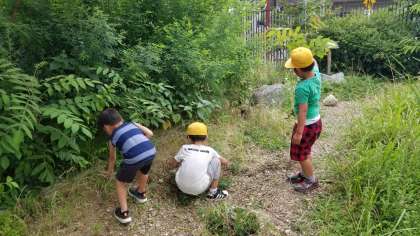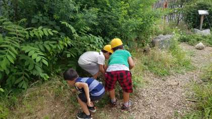 そうじの時間、学習園やビオトープに1年生の姿が……。
