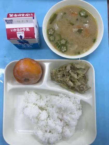 ピリ辛野菜炒め、オクラ豚汁、冷凍みかん、ご飯、牛乳