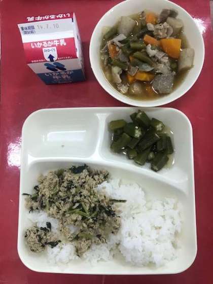 豚肉とジャガイモの煮物、オクラの甘酢あえ、ツナ葉炒め、ご飯、牛乳