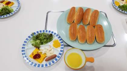 パン、サラダ、オムレツ、ウインナー、コーンスープ、野菜ジュースでした。