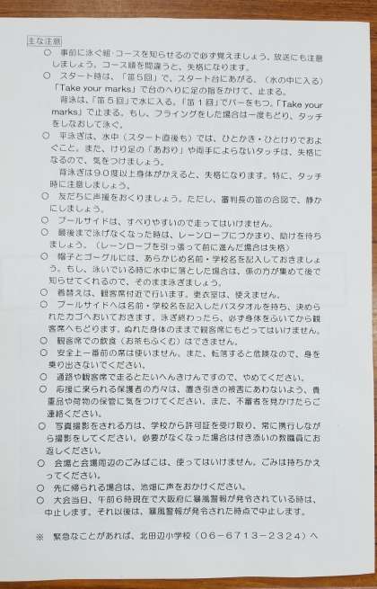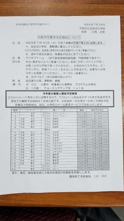 大阪市児童水泳記録会に参加する児童にお手紙を配布しました。(5.6年で申し込みをした児童のみ)
