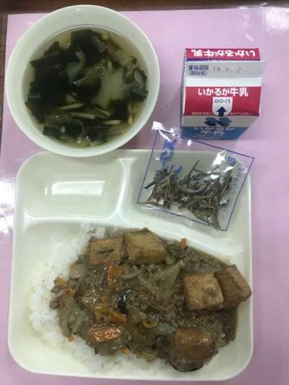 マーボー厚揚げ丼、中華スープ、ミニフィッシュ、牛乳