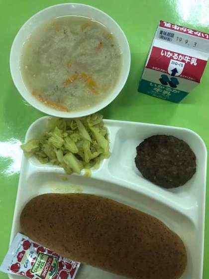 ハンバーグ、豆乳スープ、キャベツのカレーソテー、牛乳、ライ麦パン