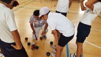 ボッチャとはパラリンピックの競技で、ジャックボールという白玉に、赤玉、青玉をどれだけ近づけることができるかを競う競技です。