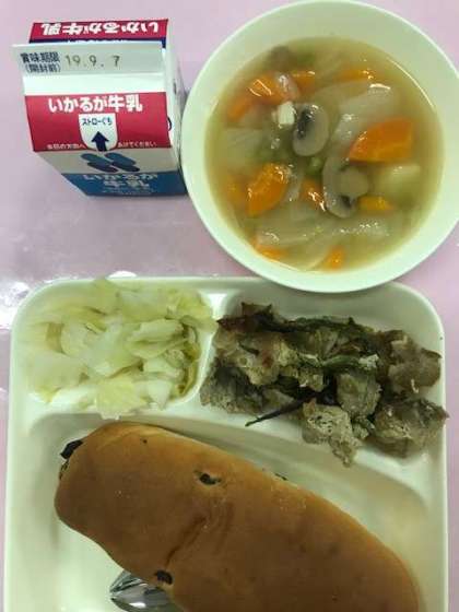 豚肉のカレー風味焼き、スープ煮、サワーキャベツ、レーズンパン、牛乳