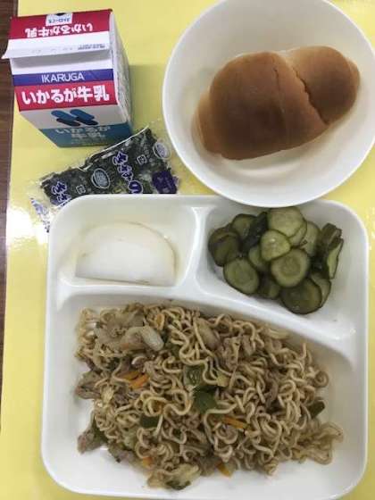 焼きそば、きゅうりの甘酢漬け、なし、牛乳、黒糖パン
