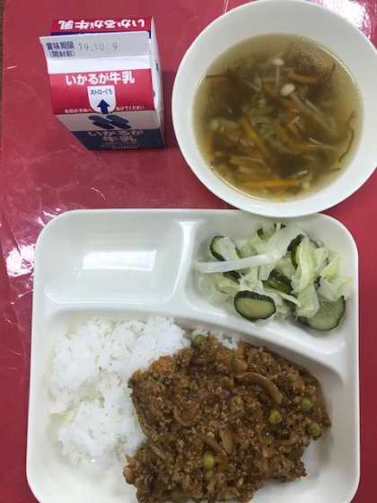 タコライス、もずくと白ネギのスープ、キャベツときゅうりのサラダ、牛乳