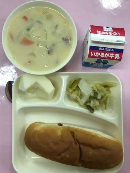 おさつパン、コーンクリームシチュー、白菜のピクルス、りんご、牛乳