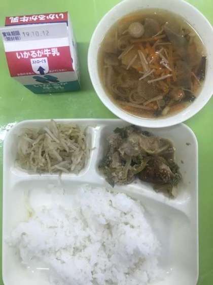 ご飯、牛乳、鶏肉のゴマだれ焼き、ソーキ汁、もやしのしょうが醤油あえ、