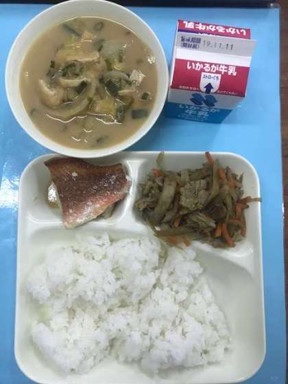 赤魚の醤油だれかけ、味噌汁、きんぴら、ご飯、牛乳