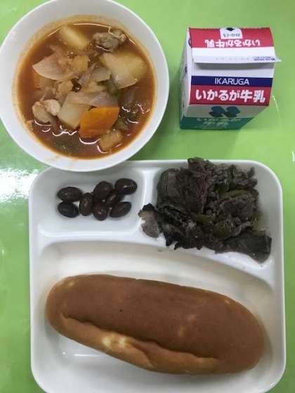 牛肉の香味やき、ケチャップ煮、うずら豆のグラッセ、おさつパン、牛乳
