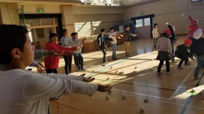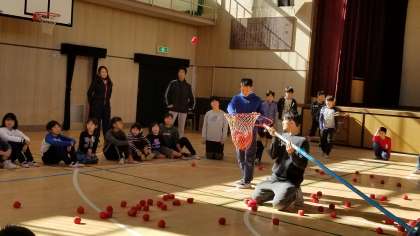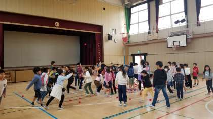 パプリカの曲に合わせ、高学年は踊り低学年が玉入れをしたり、低学年が踊り高学年が玉入れをしたりします。