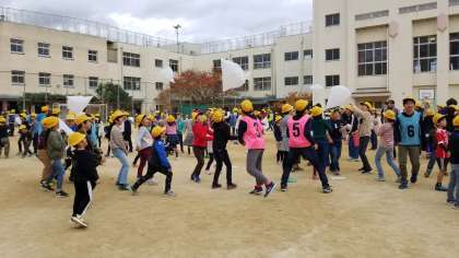 ビニル袋に空気をいれ、班のみんなで優しくポンポン。