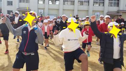 まず、「エビカニクス」の曲に合わせて準備体操をしました。