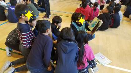 大好きな6年生の読み聞かせに聞き入る姿、温かい雰囲気いっぱいの講堂でした。