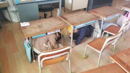 まずは、避難訓練です。地震から身を守るために机の下に避難して頭を守ります。机の脚をしっかり握り、机が動かないようにしました。続いて津波から身を守るために3階まで上がりました。