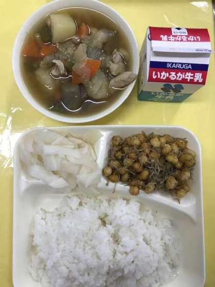 鶏肉と野菜の煮物、ジャコ豆、かぶの柚子風味、ご飯、牛乳