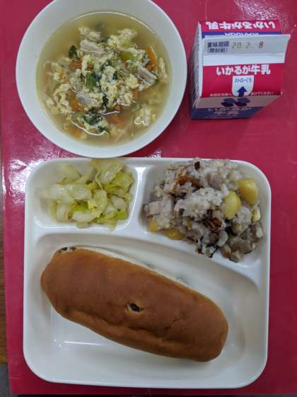 中華おこわ、たまごスープ、キャベツのオイスターソースいため、レーズンパン、牛乳