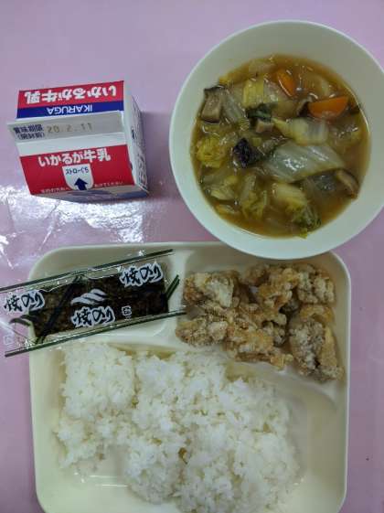 鶏肉の唐揚げ、丸天と野菜のうま煮、焼き海苔、ご飯、牛乳