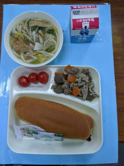 豚肉とごぼうの煮物、なにわうどん、プチトマト、コッペパン、牛乳