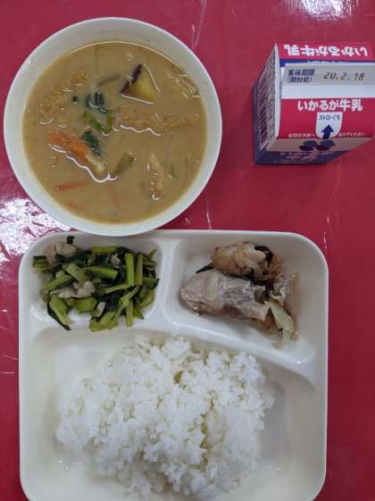 鶏肉のゆず塩焼き、さつま芋の味噌汁、小松菜のにびたし、ご飯、給食