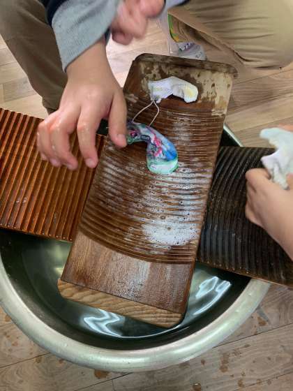 昔の道具について学んだので、洗濯板とたらいを使っての洗濯に挑戦!!!