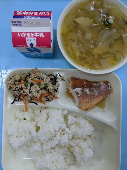 赤魚の醤油ダレかけ、うすくず汁、高野豆腐の炒り煮、ご飯、牛乳