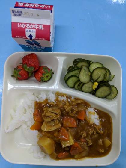 ポークカレーライス、きゅうりとコーンのサラダ、いちご
