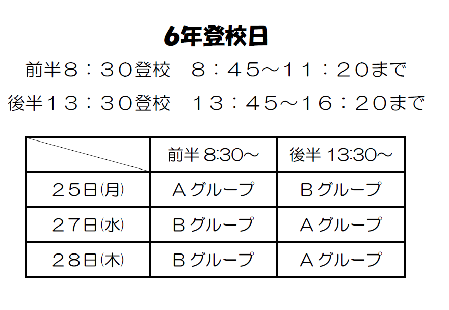 また、6年生以外につきましては、これまで通りの登校日を実施いたします。