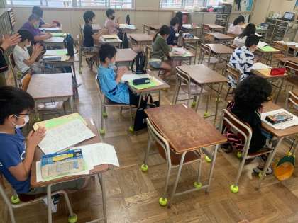 2時間目は、計算ドリルの解説と運動をしました。はじめて『てんか』という遊びをして、子どもたちは楽しそうでした。