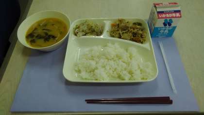 ぶたにくとやさいのいためもの、みそしる、キャベツのあかじそあえ、ごはん、牛乳