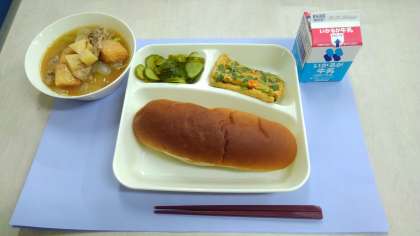 ぶたにくとやさいのにもの、チヂミ、きゅうりのあまずあえ、こくとうパン、牛乳