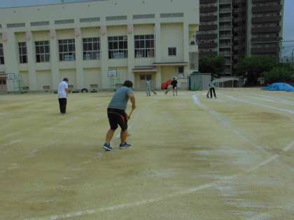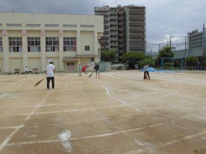 9月10日(木)の放課後に、にがりまきを行いました。運動場の砂ぼこりが抑えられ、運動会の練習もしやすくなります。